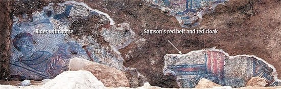 The Huqoq synagogue in Israel?excavated by Jodi Magness and Shua Kisilevitz?yielded this mosaic of Samson in the Bible, carrying the gate of Gaza on his shoulders. Photo: Jim Haberman. ?성경을 들고 있는 삼손의 모자이크