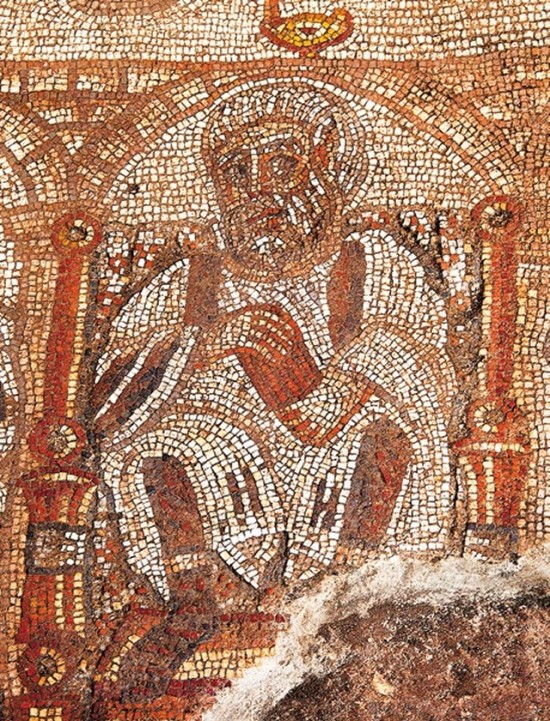 A large seated elderly man holding what appears to be a scroll, detail of a mosaic found at the Huqoq synagogue. Photo: Jim Haberman.