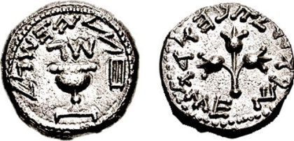 유대전쟁 "제 2년" 은전 (서기 67-68) 앞면: 진주로 장식된 성배위에 히브리어로 제 2년을 나타내는 " "가 있고 테두리 주변으로는 "셰켈 이스라엘, 즉 "이스라엘의 세겔"이라는 구절이 새겨져 있다. 뒷면: 세 갈래로 뻗어난 석류 주위로 "예루샬라임 하크도샤, 즉 "거룩한 예루살렘"이라는 히브리어 글귀가 새겨져 있다.