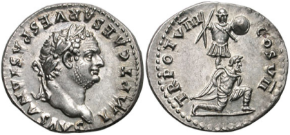 Roman denarius depicting Titus, c. 79. The reverse commemorates his triumph in the Judaean wars, representing a captive kneeling in front of a trophy of arms.